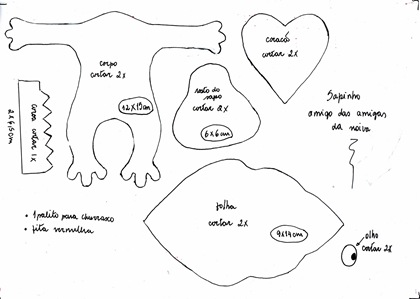 Recorte o corpo 2 vezes, a cabeça 2 vezes, o coração 2 vezes, o olhinho 2 vezes, a coroa 1 vez.